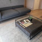 ソファに合わせたTVボードとサイドテーブルも、モダンなで軽やかなものを。